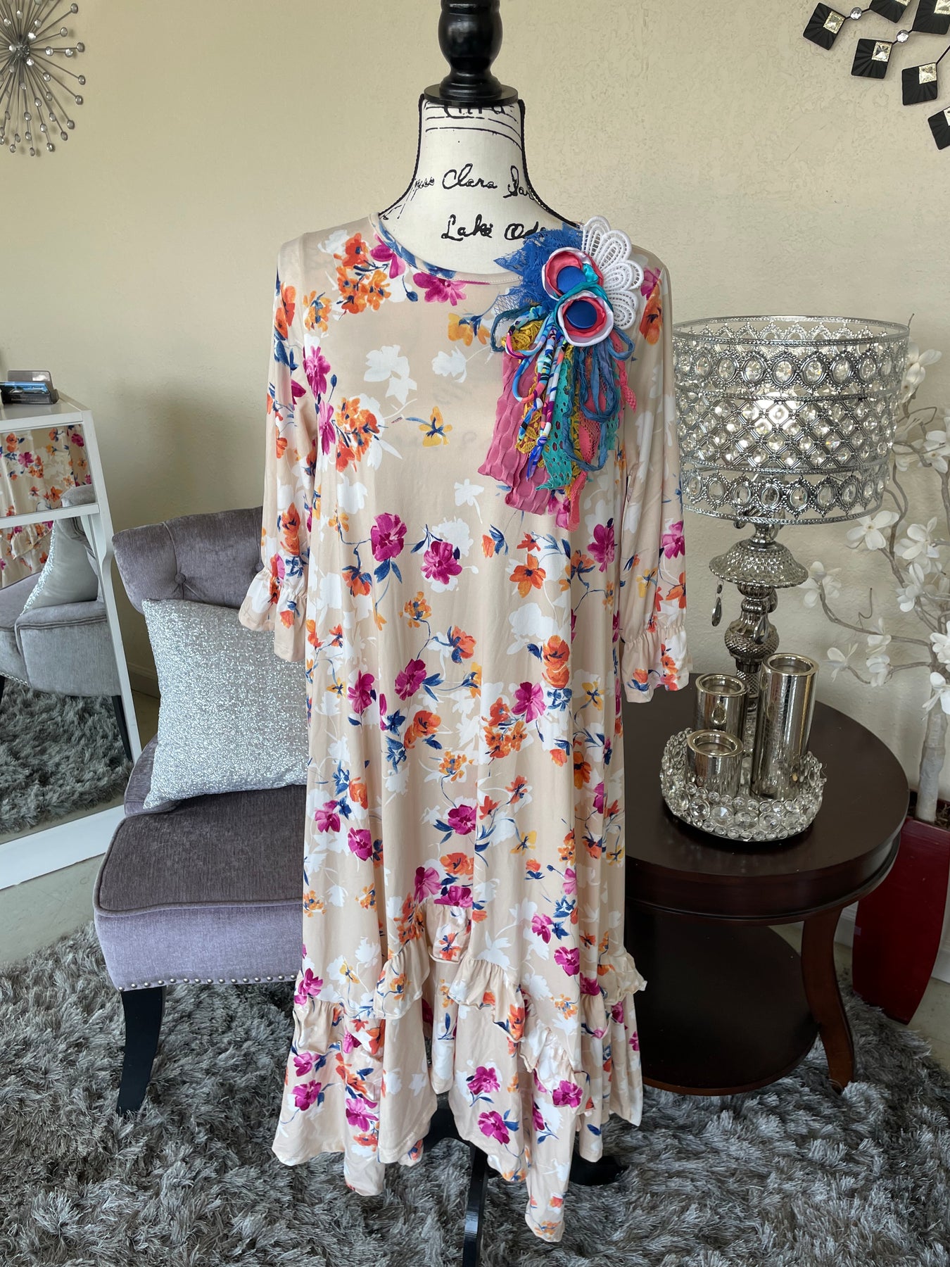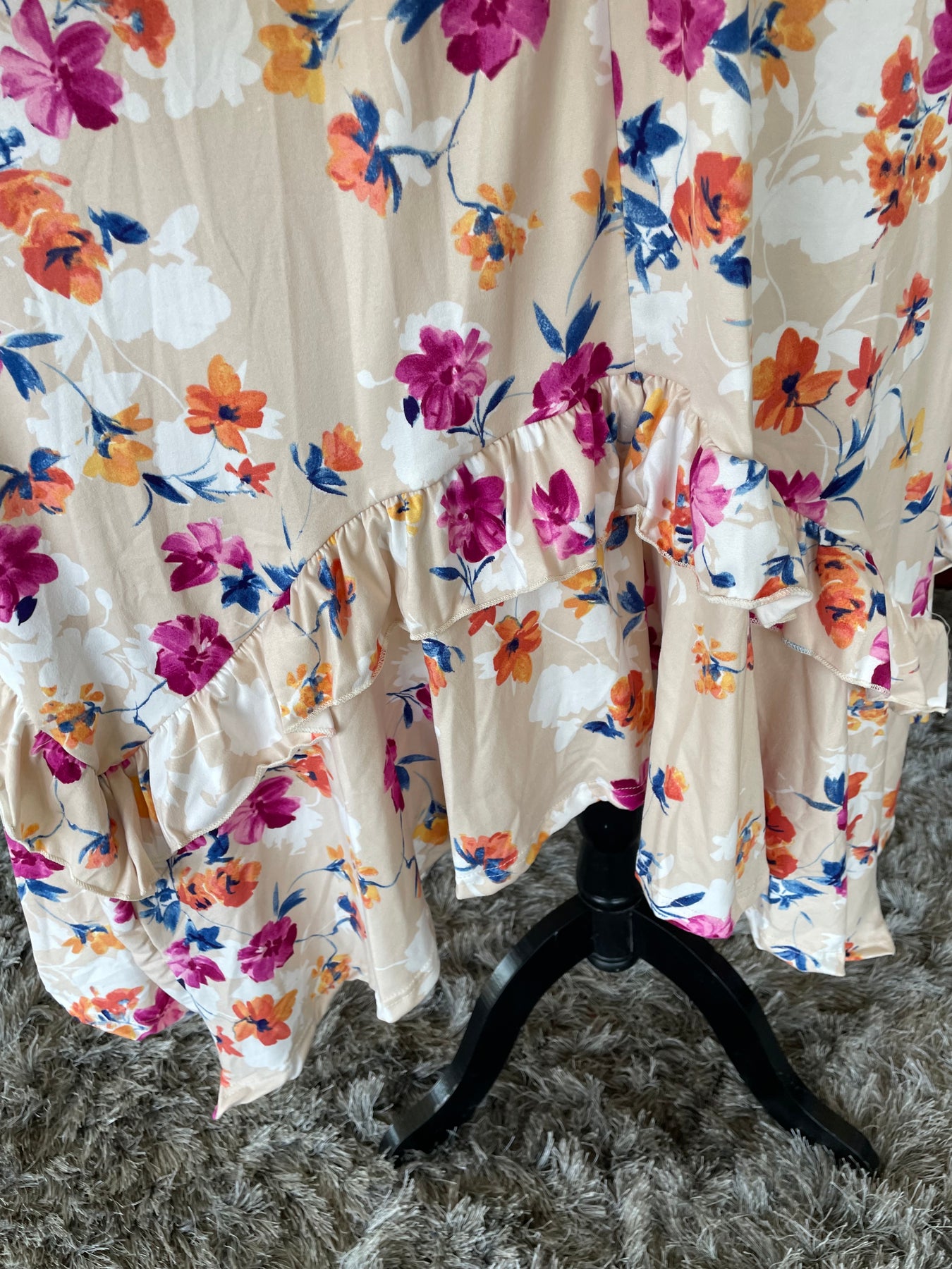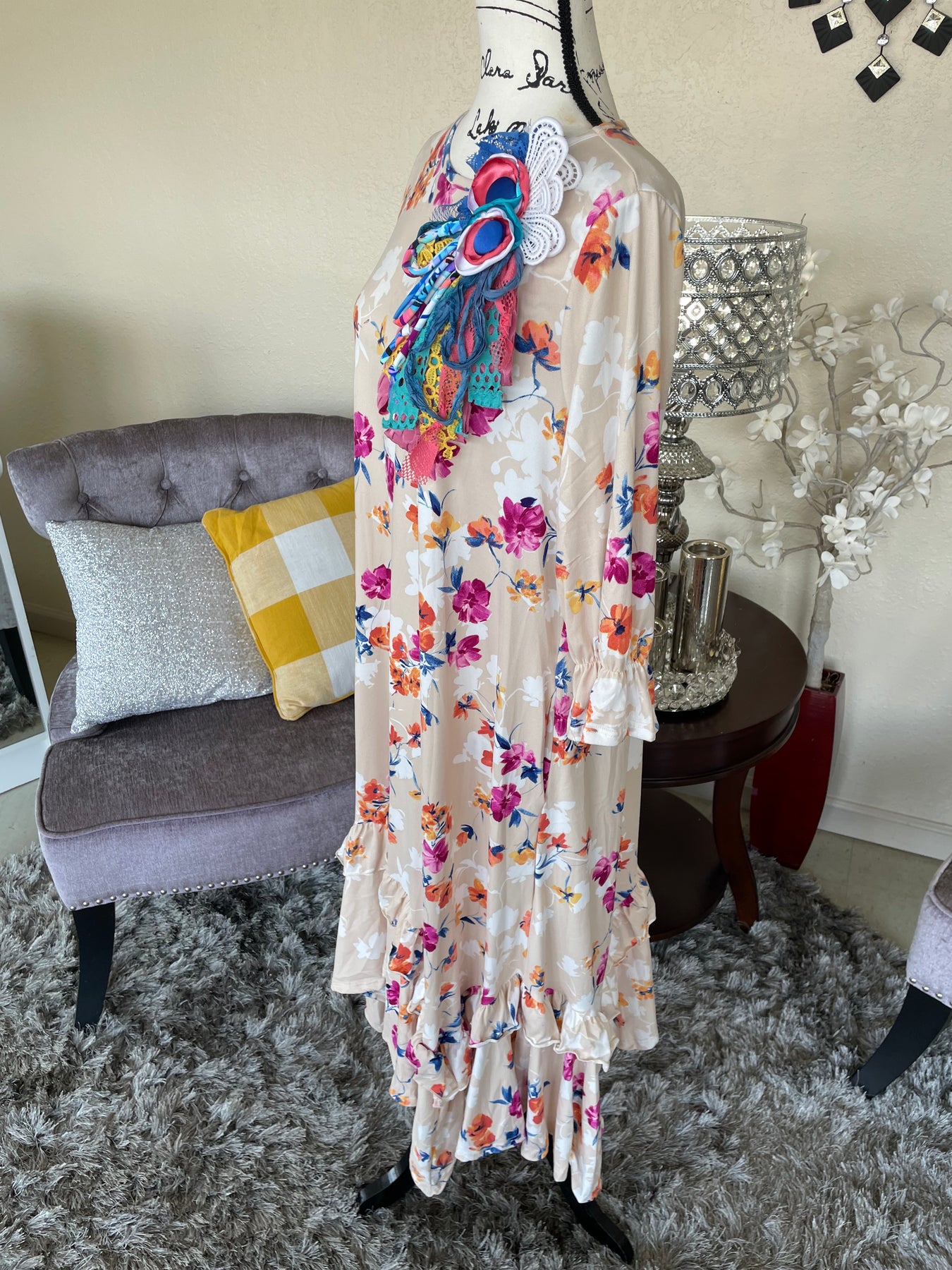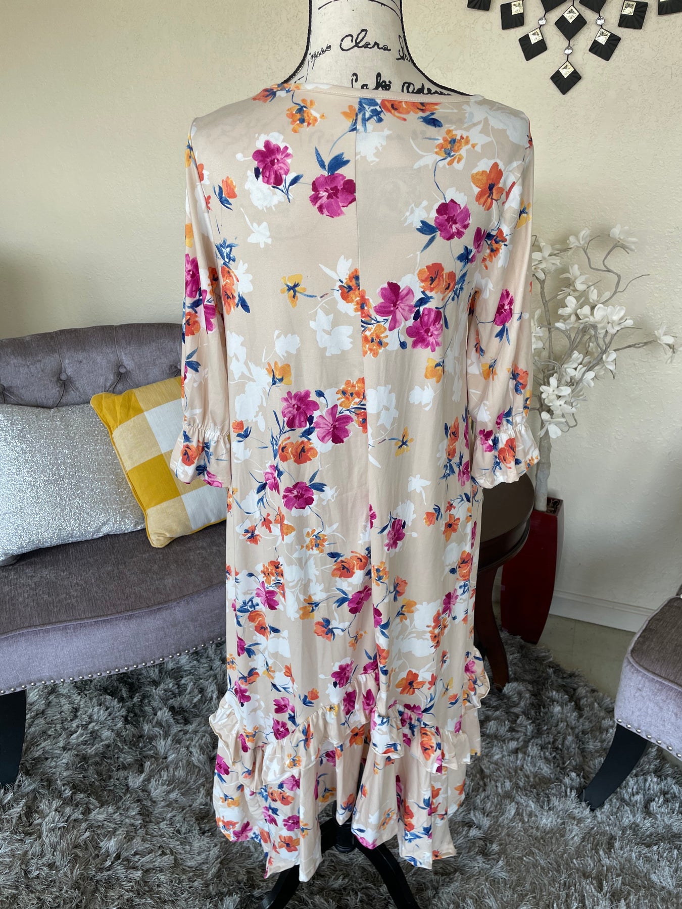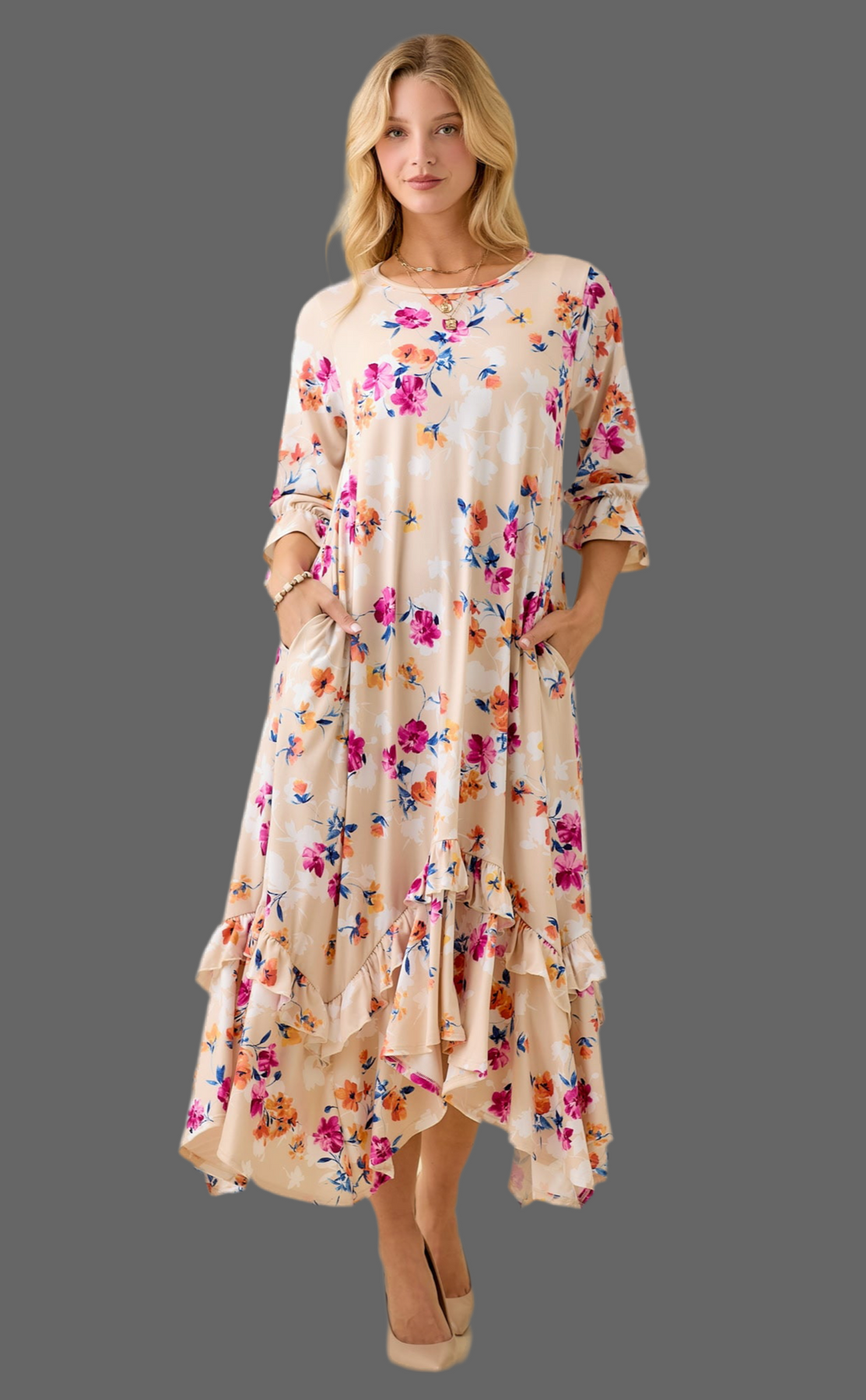 Add timeless charm to your boutique with our Floral Ruffle Hem Modest Midi Dress, where elegance meets everyday comfort. This beautiful and flowy A-line silhouette features a round neckline, 3/4 ruffle sleeves, and a high-low ruffle hem that moves with grace. The soft floral print in Pink and Beige Floral gives this dress an ultra-feminine and modest vibe, perfect for church, special events! Crafted in a breathable, lightweight knit, this modest midi dress includes hidden side pockets for everyday ease! 85% Poly, 15% spandex