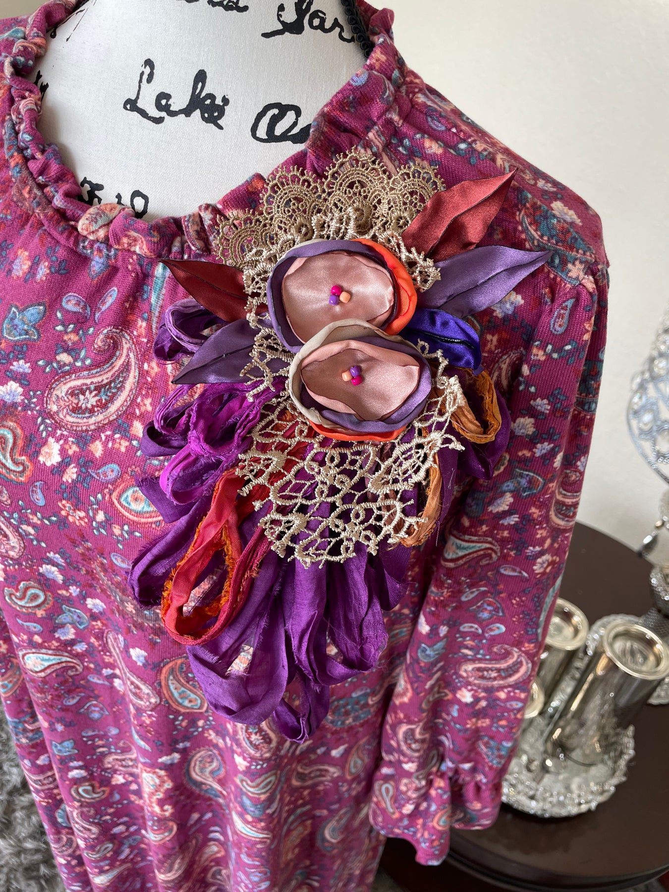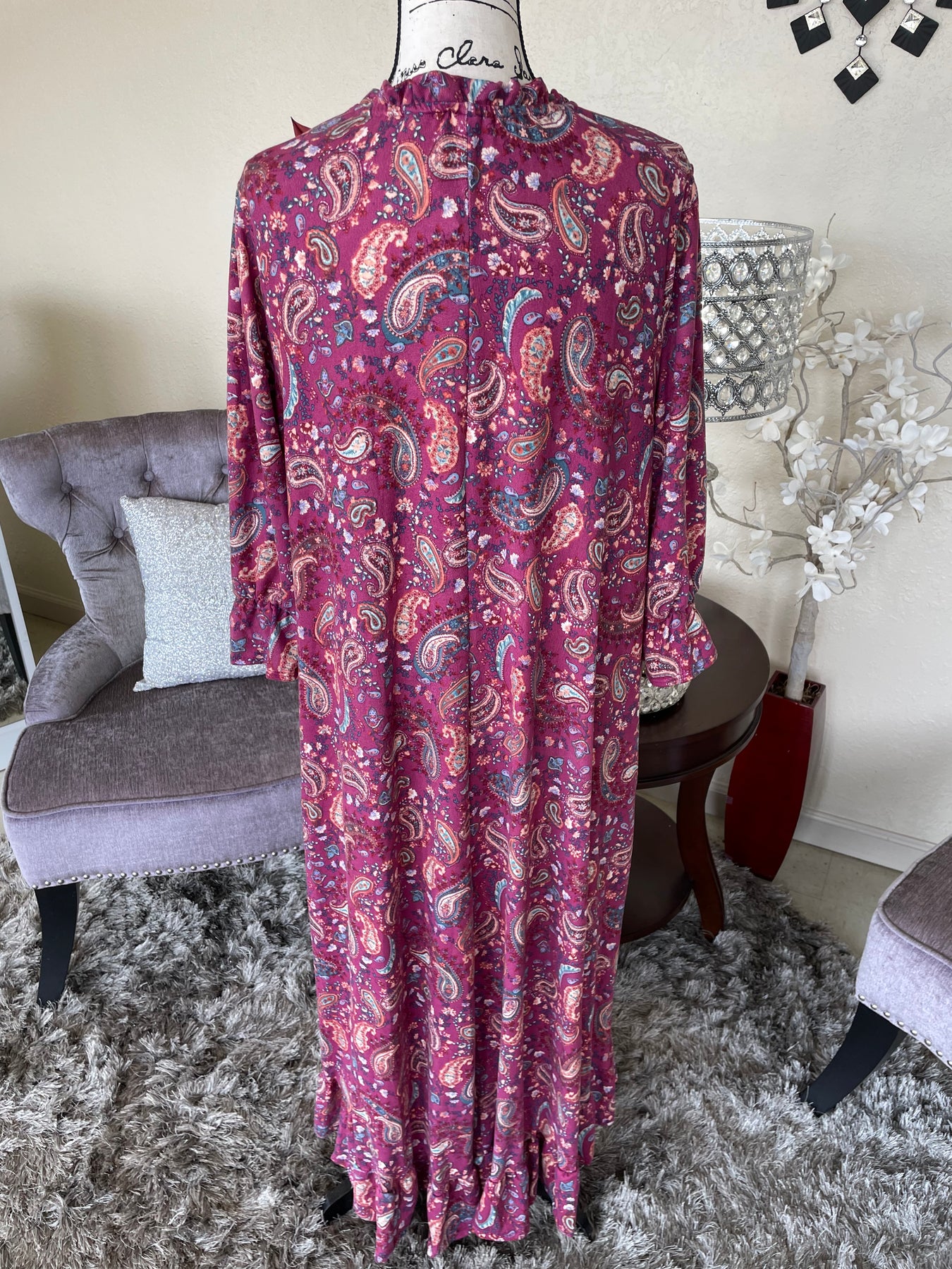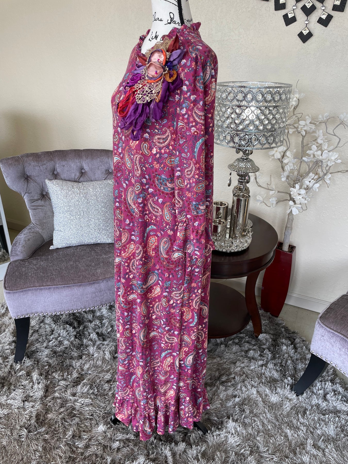 Elevate your style with this beautiful magenta paisley textured maxi dress! Crafted with a flowing silhouette, it offers both comfort and elegance. Ruffled hem. Perfect for fall and winter! 92% Polyester 8% Spandex