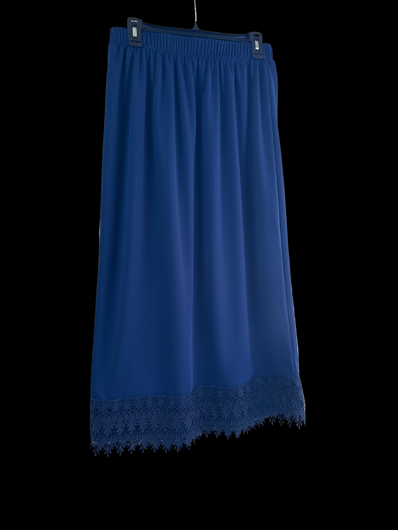 New Arrival! This plus size Royal Blue Layering Skirt is perfect for extending the length on shorter dresses or wearing alone with a tunic/top. Two rows of lace on the bottom! A beautiful classy skirt! Beautiful easy care ITY fabric in a color that can be worn all year long! 35” length